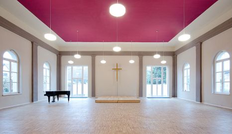 Das Bestandsgebäude bleibt weitestgehend unangetastet, so haben wir die Eigenheiten des Bestehenden bewahrt. An der Strasse befindet sich der neue Eingangsbereich mit offenem Foyer. Auf der Gartenseite findet der große Gemeinderaum mit Küche und Sanitärbereich im teilunterkellerten Gebäude Platz. Der Neubau ist barrierefrei in Holzelementbauweise mit raumhoher Verglasung errichtet.
