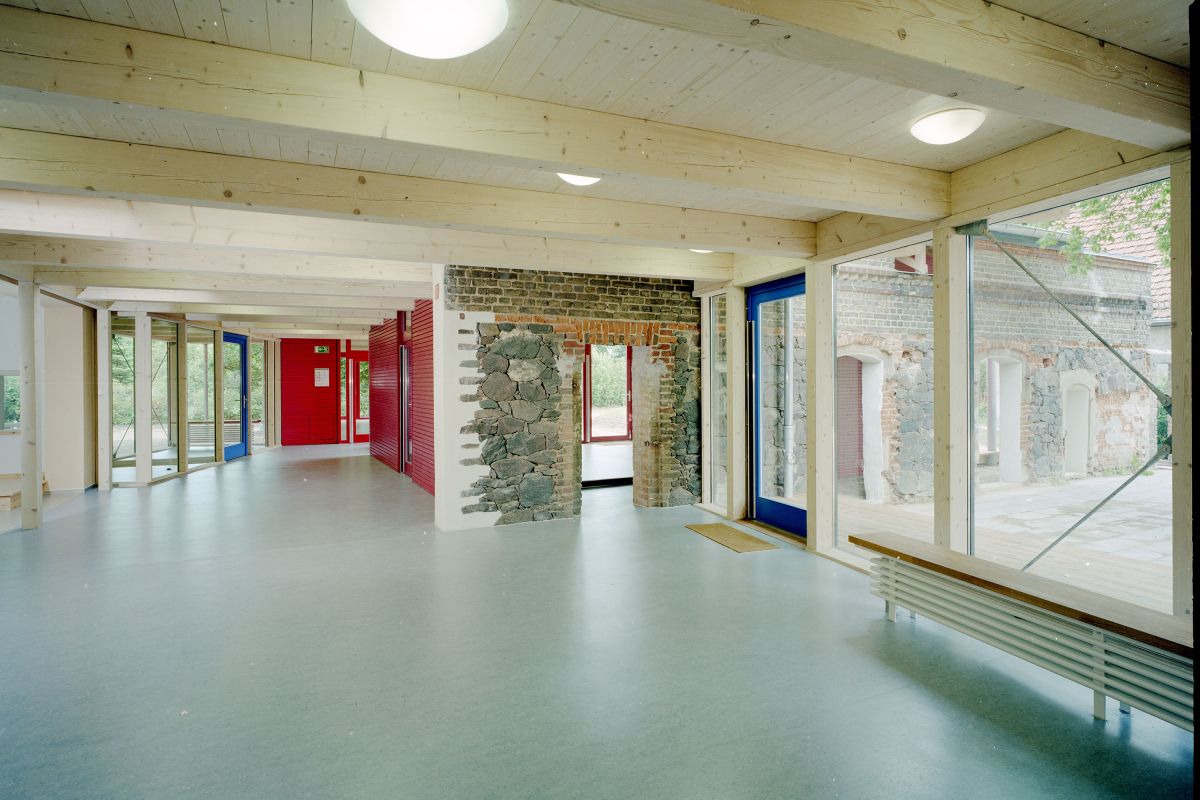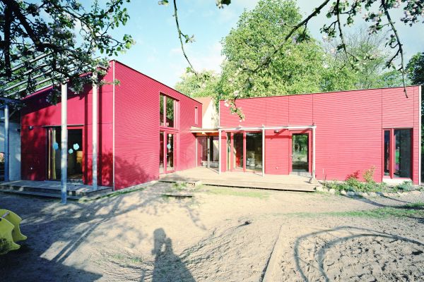 Aufgrund der unzureichenden räumlichen und funktionalen Verhältnisse wurde der Kindergarten in kostensparender Holzbauweise erweitert. Drei identische Gruppenhäuser als Holzständerbauten gruppieren sich um ein Foyer und Mehrzweckraum. Im Altbau sind die notwendigen Nebenräume und Toiletten angeordnet. Bei den Erweiterungen wurde die historische Pultdachform, die hier typisch für Nebengebäude ist, aufgenommen und variiert. Eine vorhandene Feldsteinwand der ursprünglichen Scheune wurde mit in die Gestaltung des Ensembles integriert.