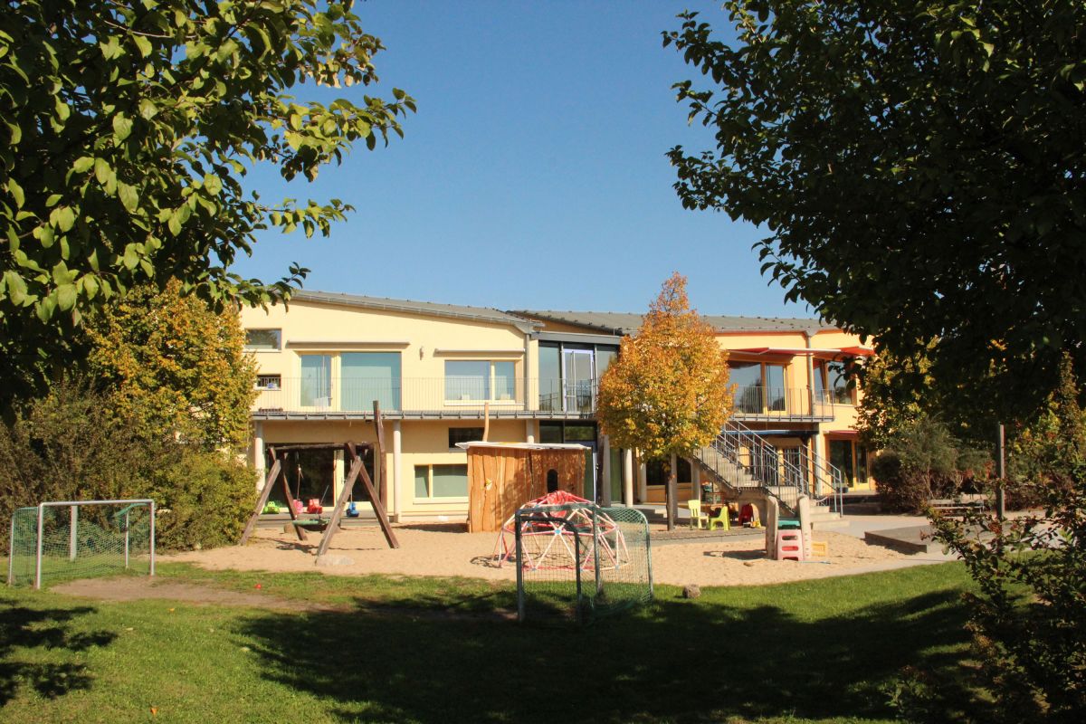 Im Grünen versteckt lässt sich die Kindertagesstätte angrenzend an ein Feld, zwischen einem Bolzplatz und einem Festplatz erahnen.
